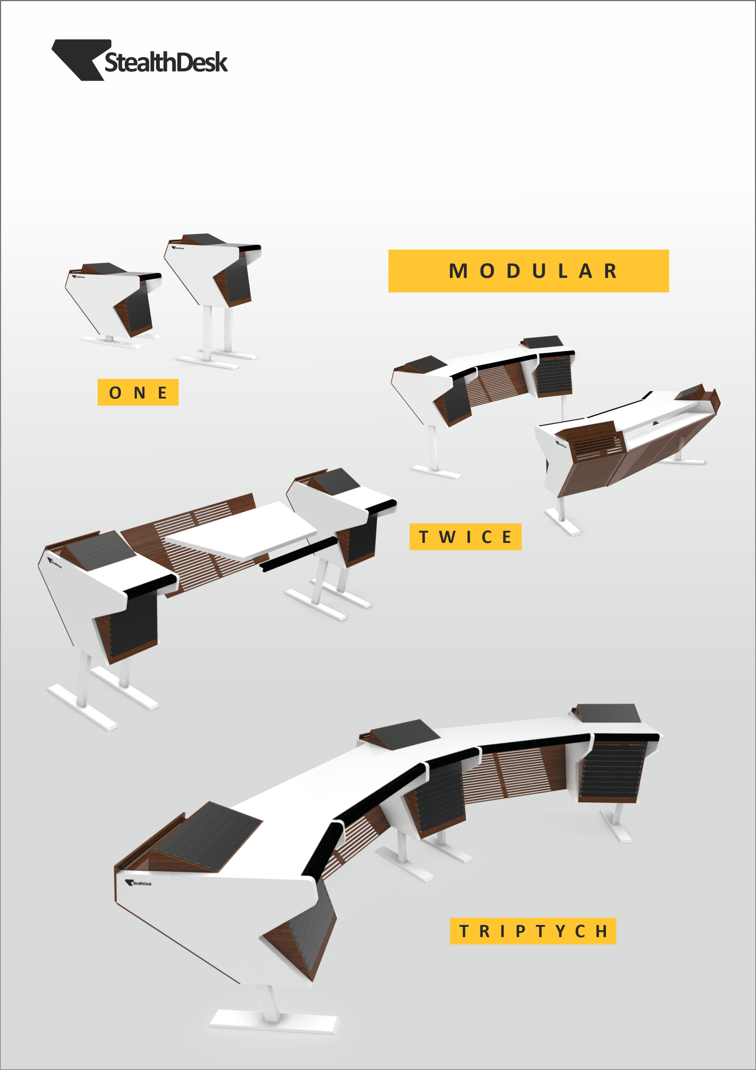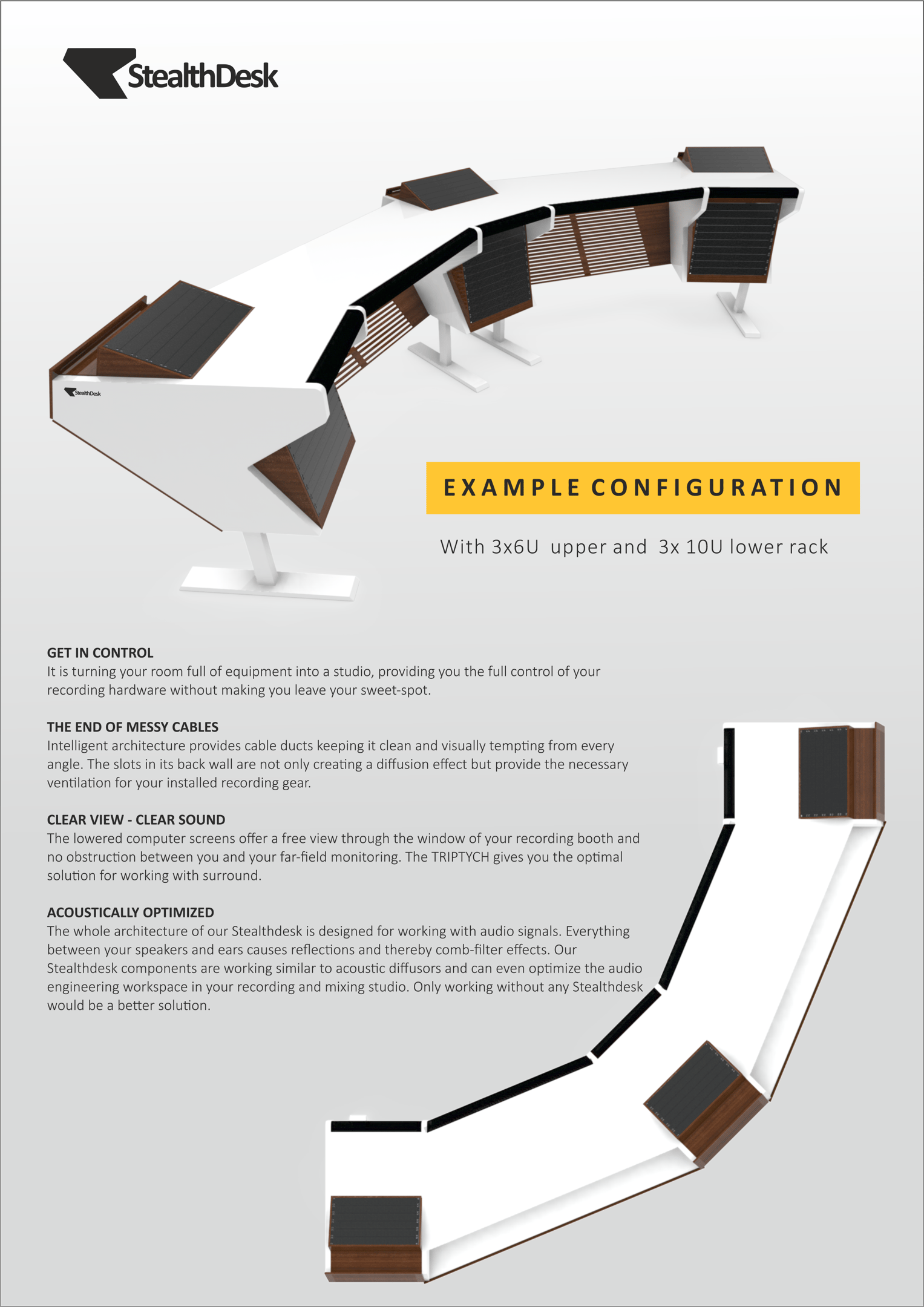 The most space-saving configuration of our Stealthdesk ONE. It is doing a great job for mastering studios, composers, small projects and home studios.